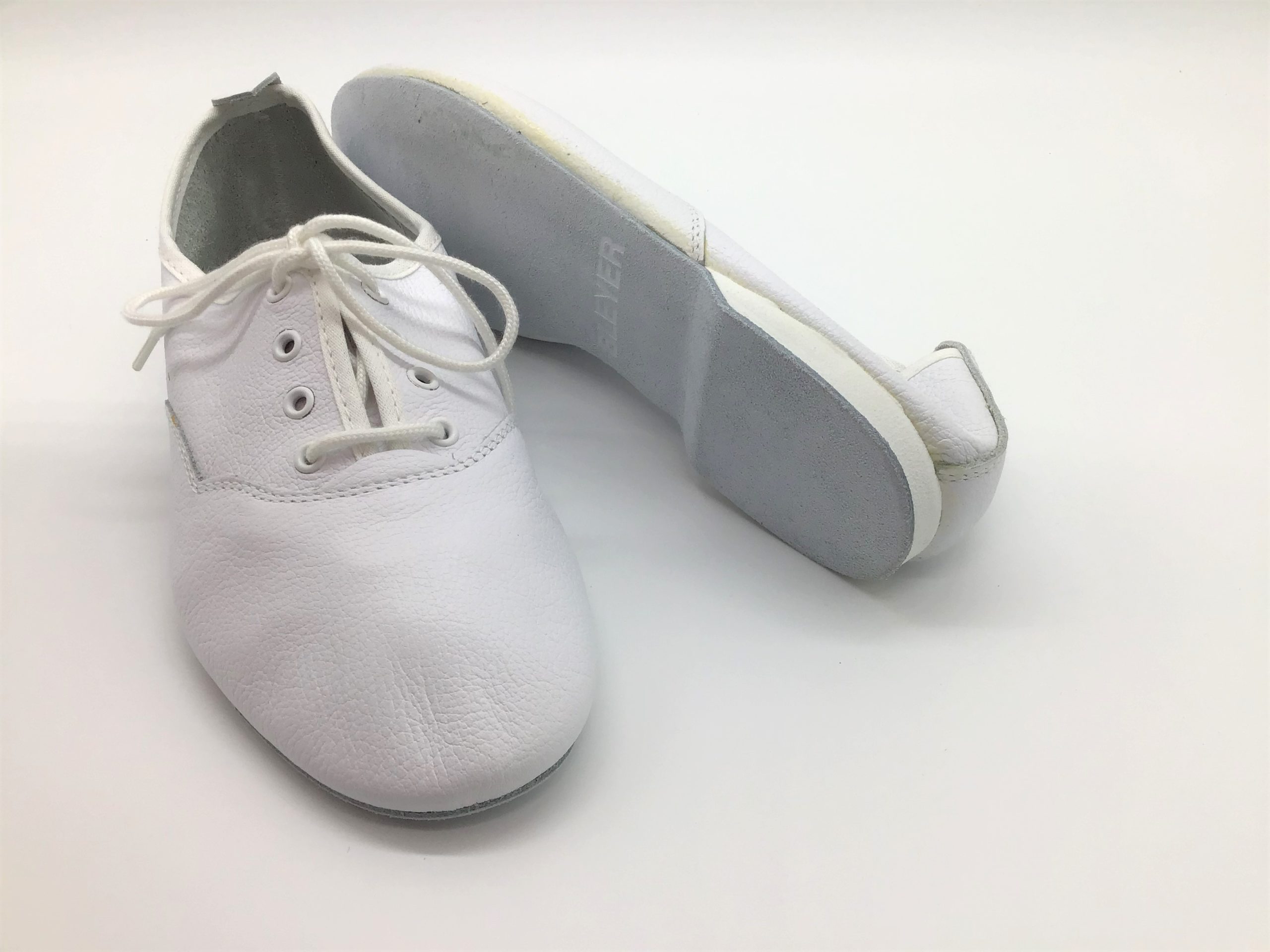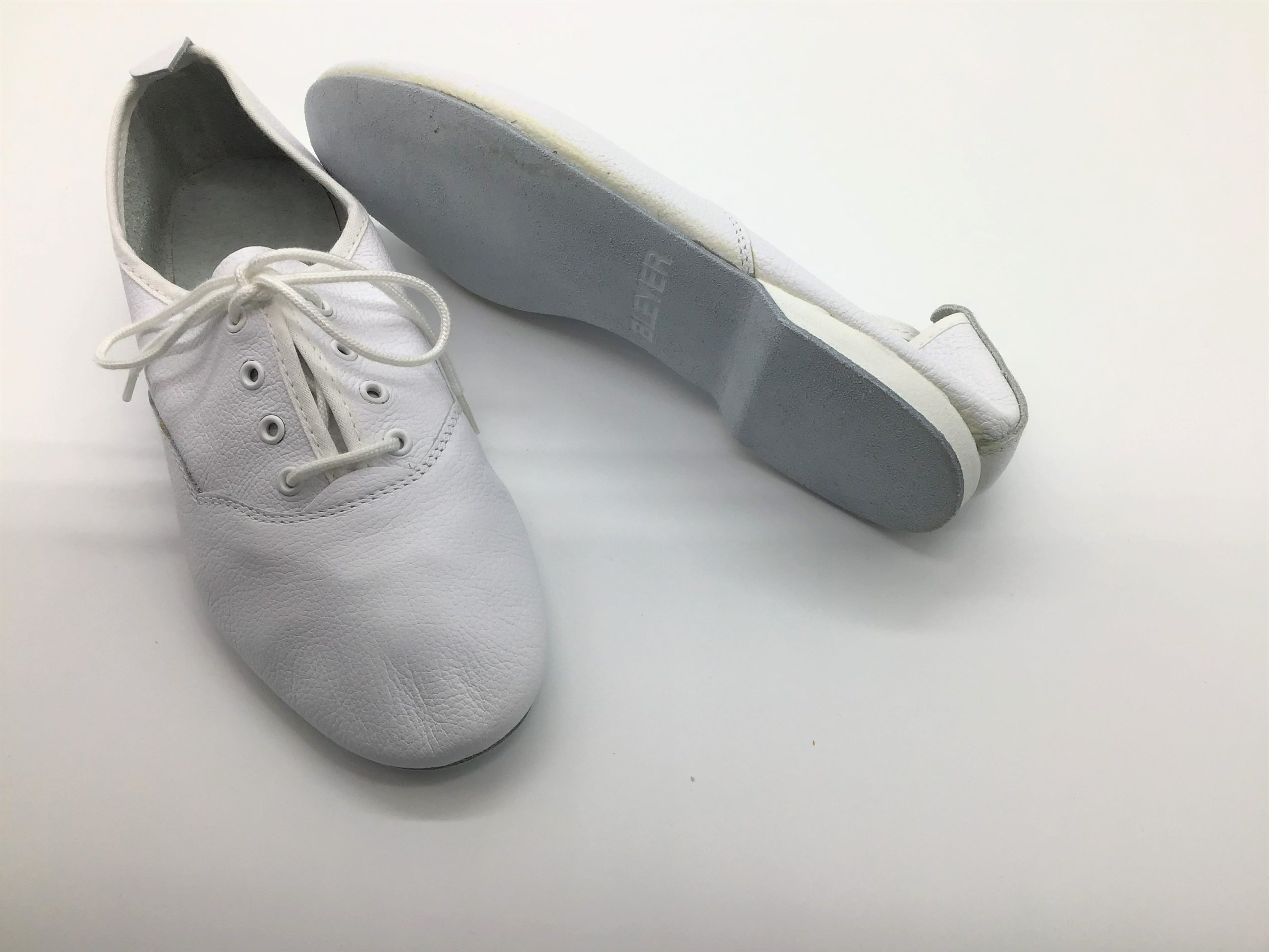 Jazzschuh aus weißem Nappaleder mit durchgehender Rauledersohle und überzogenem Absatz.