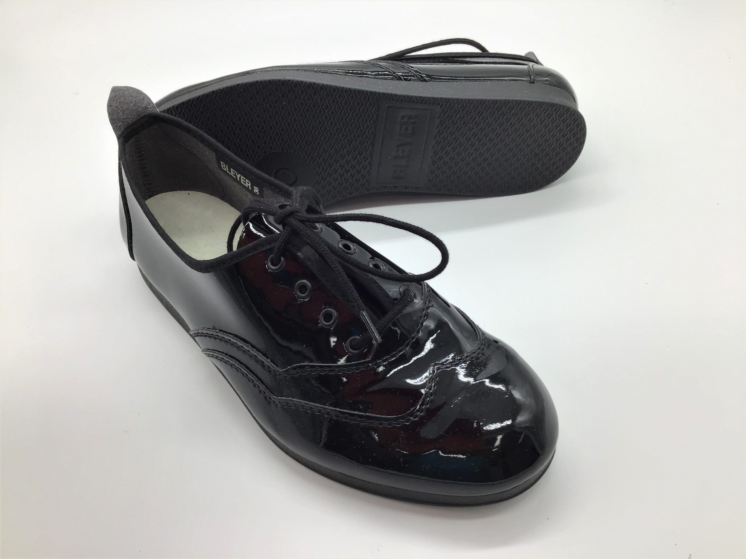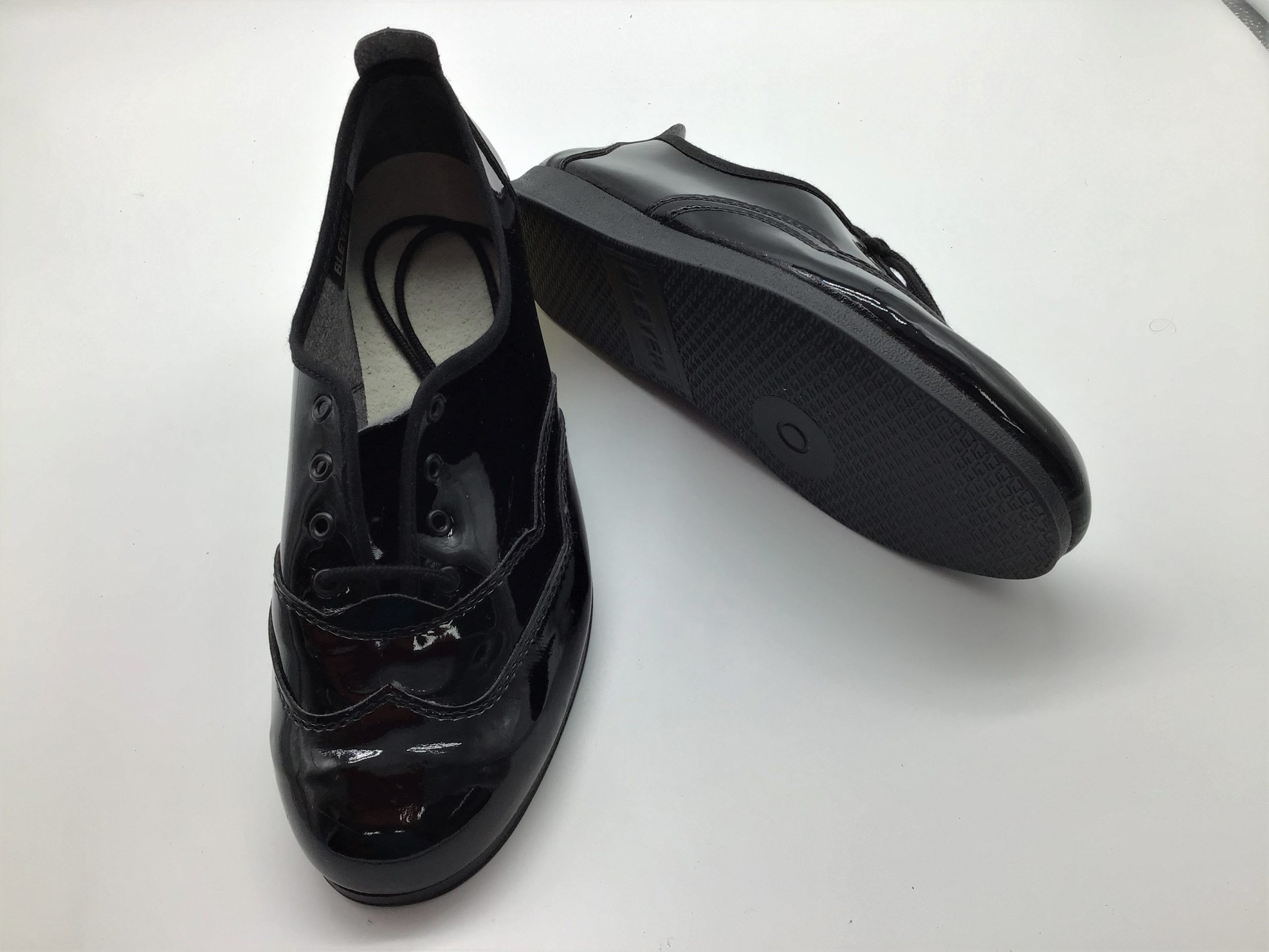 aus schwarzem hochglänzenden Lacksynthetik. Diese Lackschuhe haben eine nicht färbende gleitfähige schwarze PU-Sohle mit Drehpunkt und ein integriertes Fersenpolster.